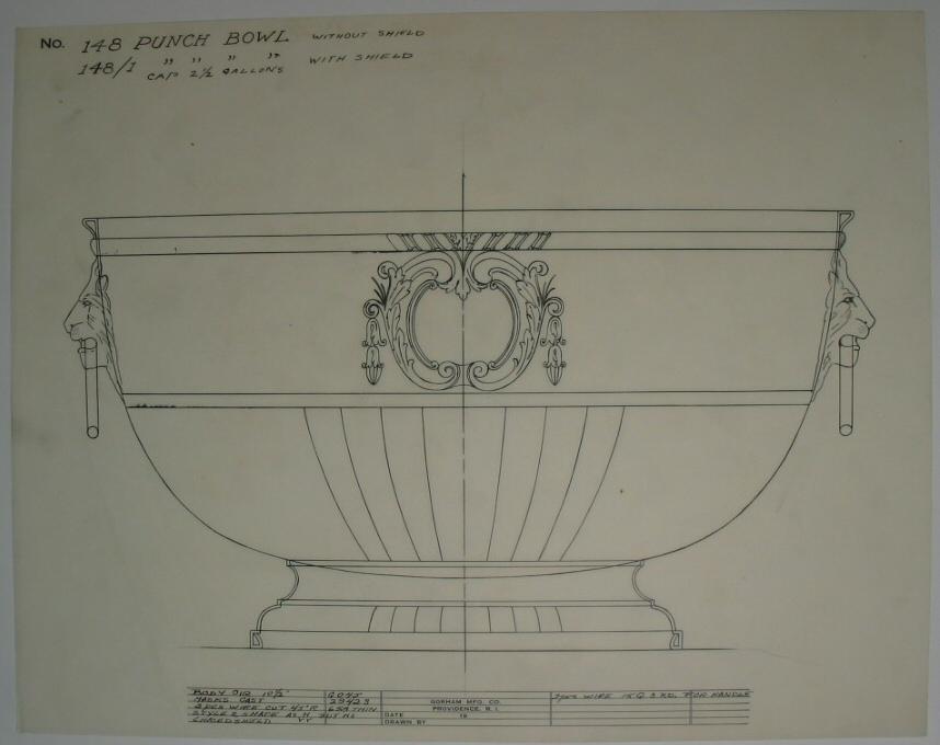 "No. 148 PUNCH BOWL WITHOUT SHIELD / 148/1 " " " " WITH SHIELD / CAP. 2 1/2 GALLONS" in upper left corner in ink.Data field at bottom margin filled in with "BODY CIR 10 1/2" G045 / MASKS CAST 29423 / 2PCS WIRE CUT 45" R 658 THIN / STYLE & SHAPE AS H/VV BUT NO CHASED SHIELD" in left column, right column filled in "2 PCS WIRE 15G 3 RD FOR HANDLE"