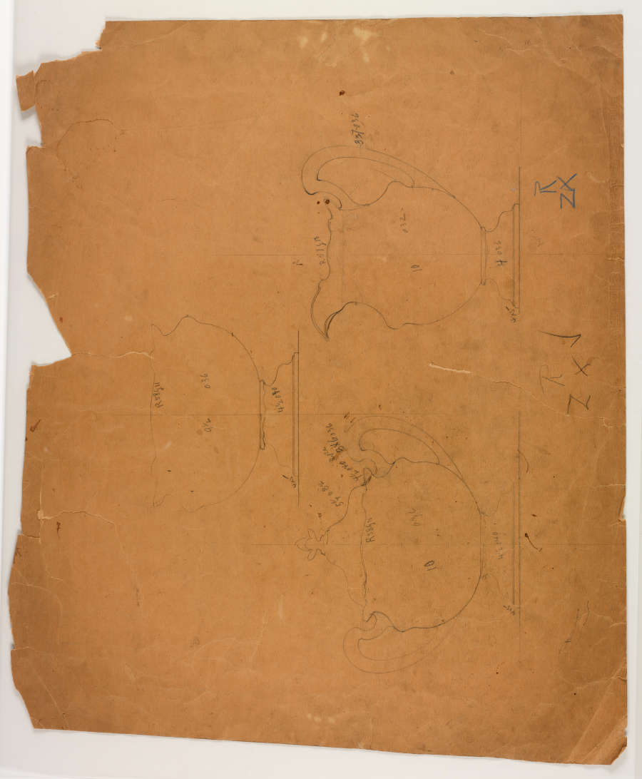 In blue crayon in lower right corner, "R/ZX". In pencil at bottom center, "R/ZX". Various measurements and manufacturing specifications on drawing in pencil.