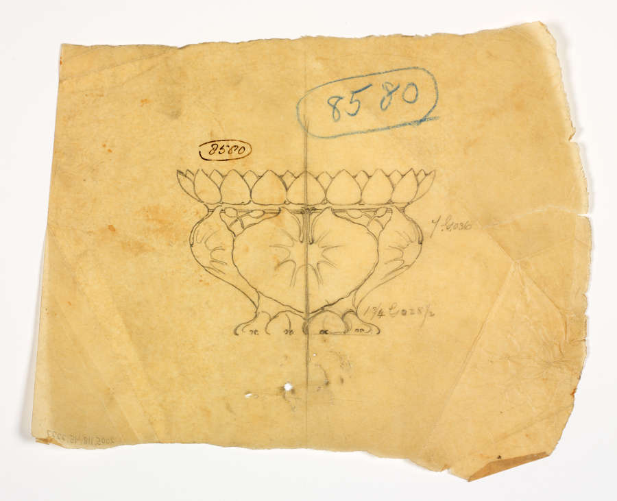 In blue crayon above bowl, "8580"circled, and in ink above rim, "8580" circled. Various manufacturing specifications on drawing in pencil along right edge of drawing.