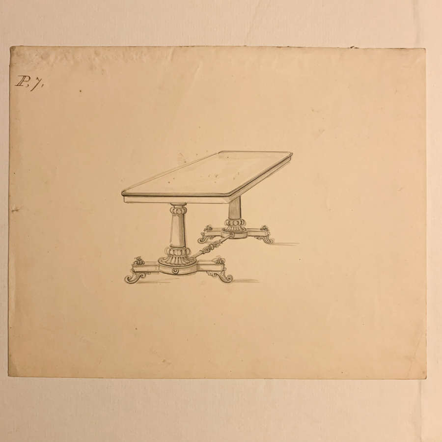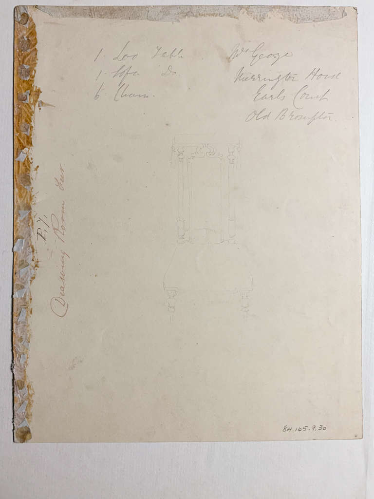 Inscribed UL:P 7Verso, in Woolley's hand:Drawing Room fur./ 1100 TableMrs. George/ 1 sofaMerrington House/ 6 ChairsEarls Court/ Old Brompton
