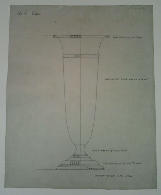 In ink in upper left corner, "No 4 VASE". In pencil in lower left corner, "No 4 VASE" and in upper right corner, "13 x 16 1/2". Various manufacturing specifications on drawing in ink.