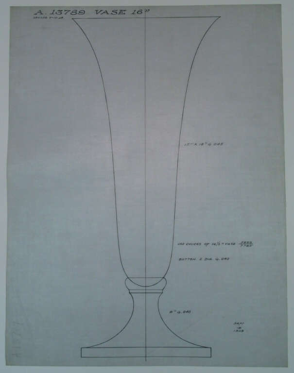In ink in upper left corner, "A.13789 VASE 16" / REVISED 9-10-29". In pencil in lower left corner, "A13789". Various dimensions and manufacturing specifications on drawing in ink.