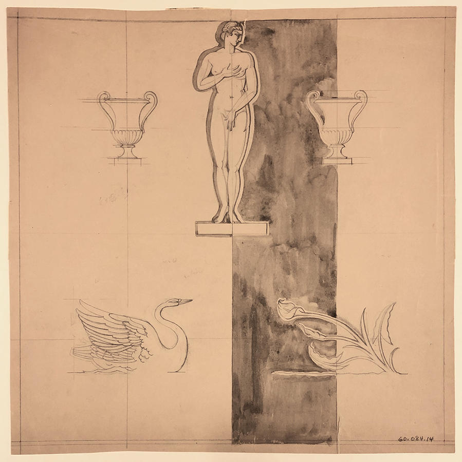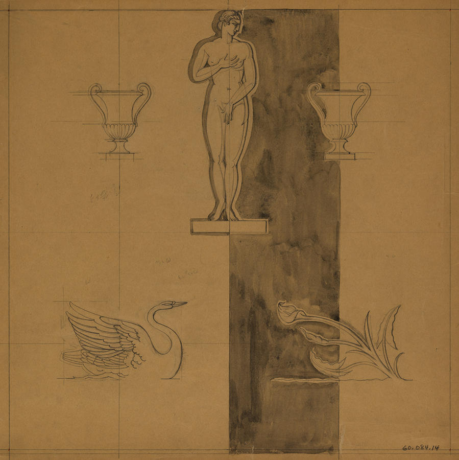 The images on this website can enable discovery and collaboration and support new scholarship, and we encourage their use. This object is in Copyright. This object is Design for Wallpaper (Lady - Lily - Swan) with the accession number of 60.084.14. To request new photography, please send an email to imagerequest@risd.edu and include your name and the object's accession number.