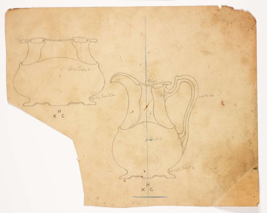 In pencil below each drawing, "H/XC". Various manufacturing specifications and dimensions on drawing in pencil, including "1 Pint"' above creamer.