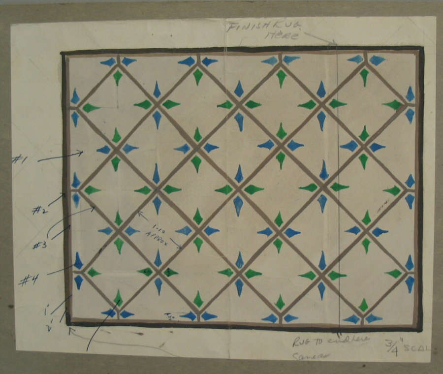 on recto in pencil: " FINISH RUG HERE / RUG TO end here same as / 3/4" SCALE" and in ballpoint pen: "#1 /#2 /#3 /#4 / 1" / 2" / 3" / 1" / 1-10 APPROX"