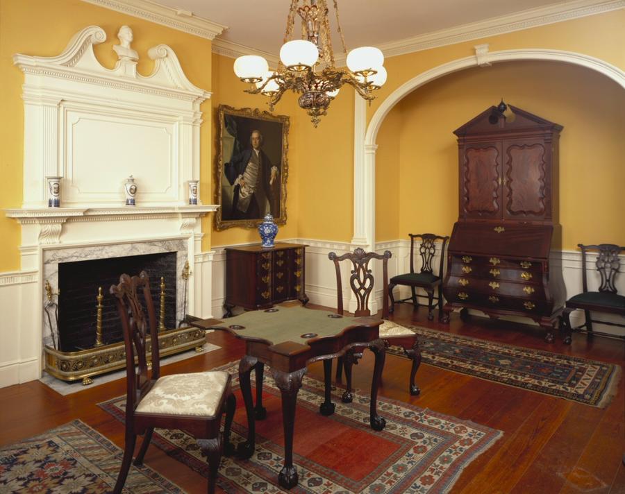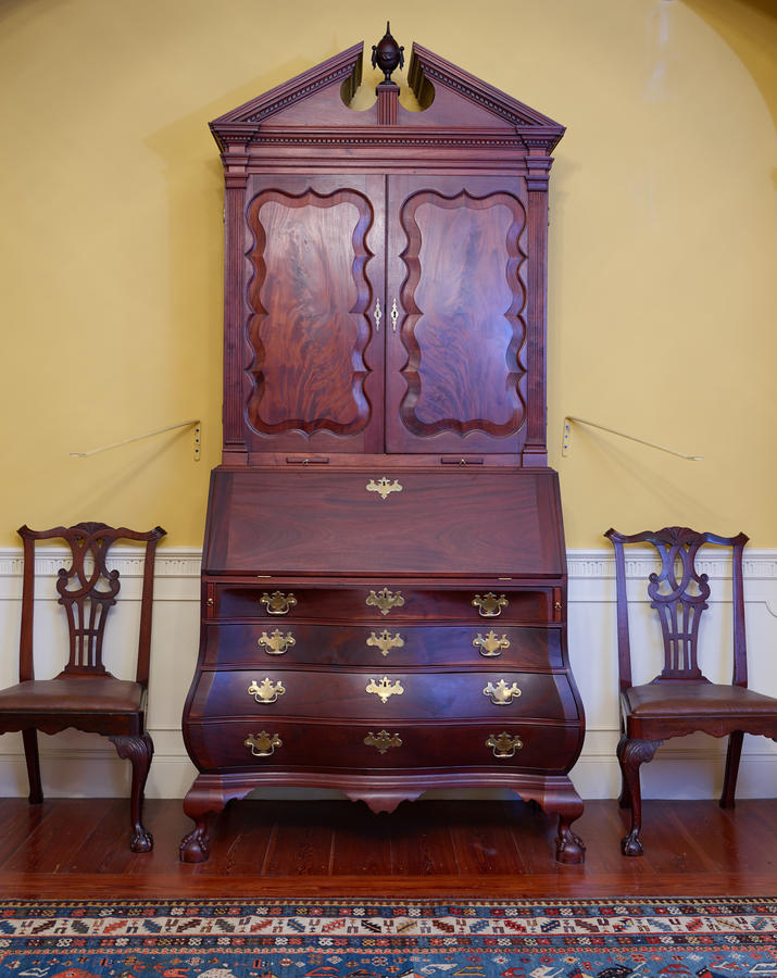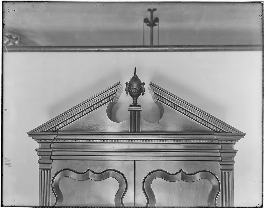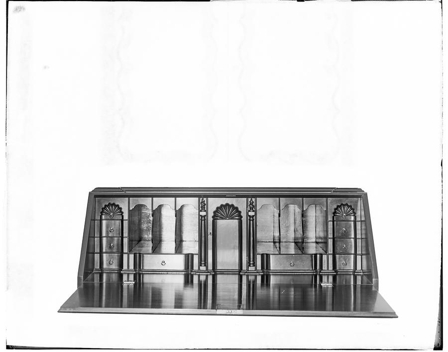 Inscription on bottom of board of bookcase:bottom Inscription on bottom of board of desk:bottom On underside of the top is a chald rendering of a cyma curve