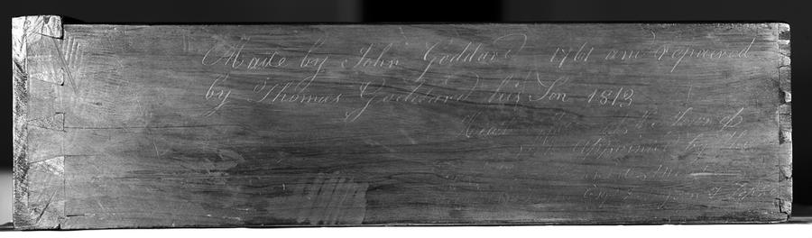 Inscription on exterior proper-left side of middle prospect drawer: Made by John Goddard 1761 and repaired / by Thomas Goddard his Son 1813 / Hea[l]th Officer of the Town of / Newport Appointed by the / Honr Town Council Members / Nicholas Taylor Esqr & my son T Topham [Thomas Goddard's son-in-law]