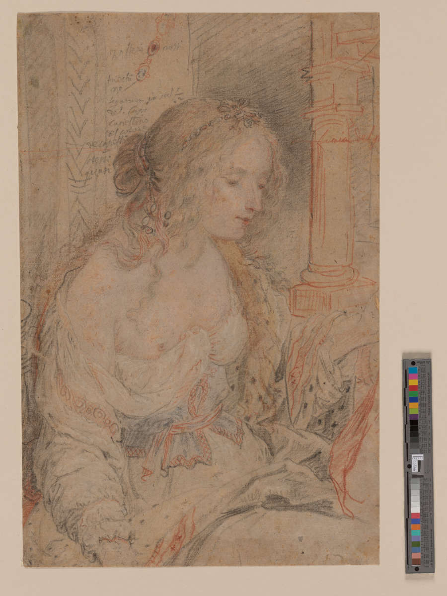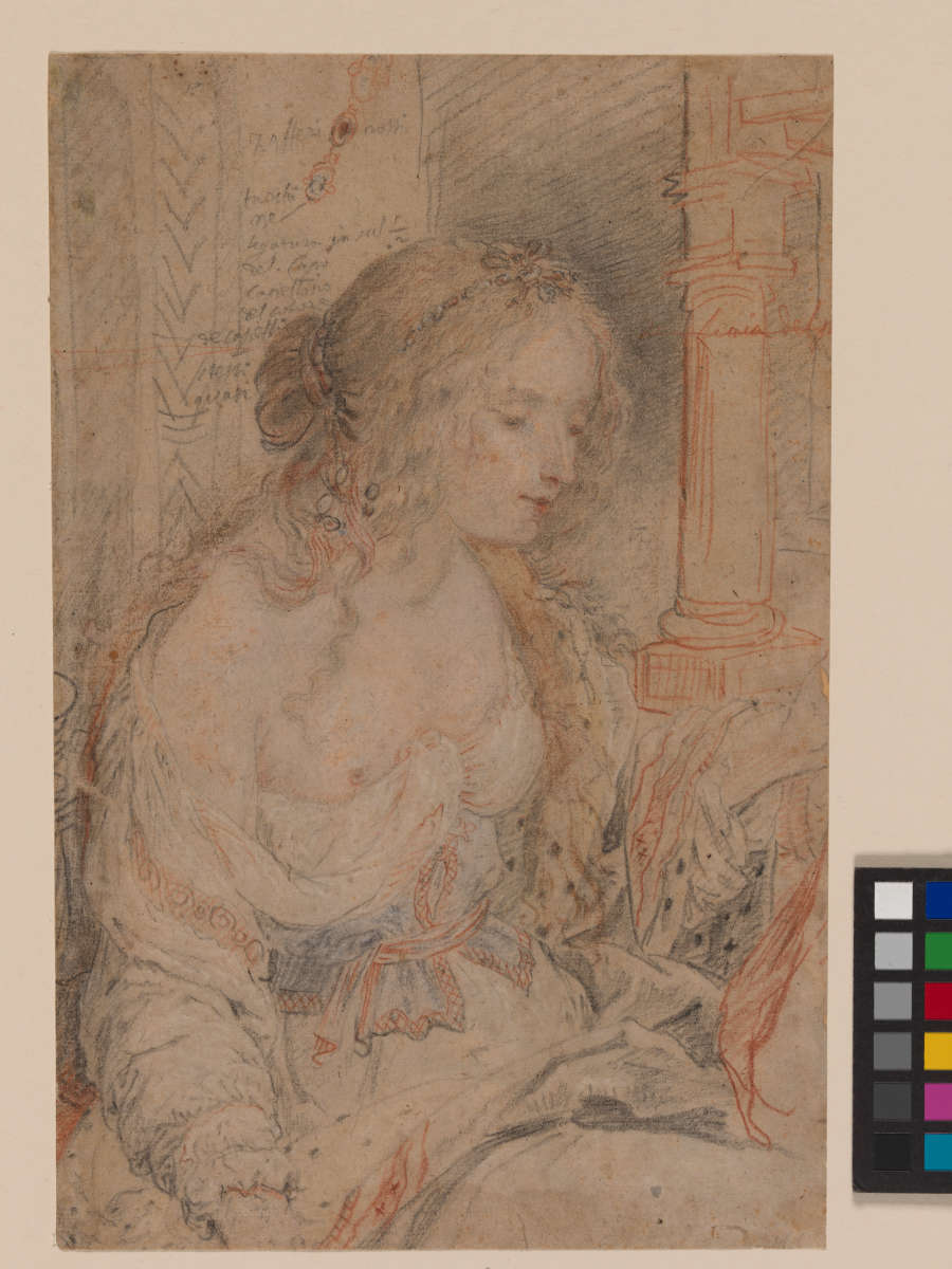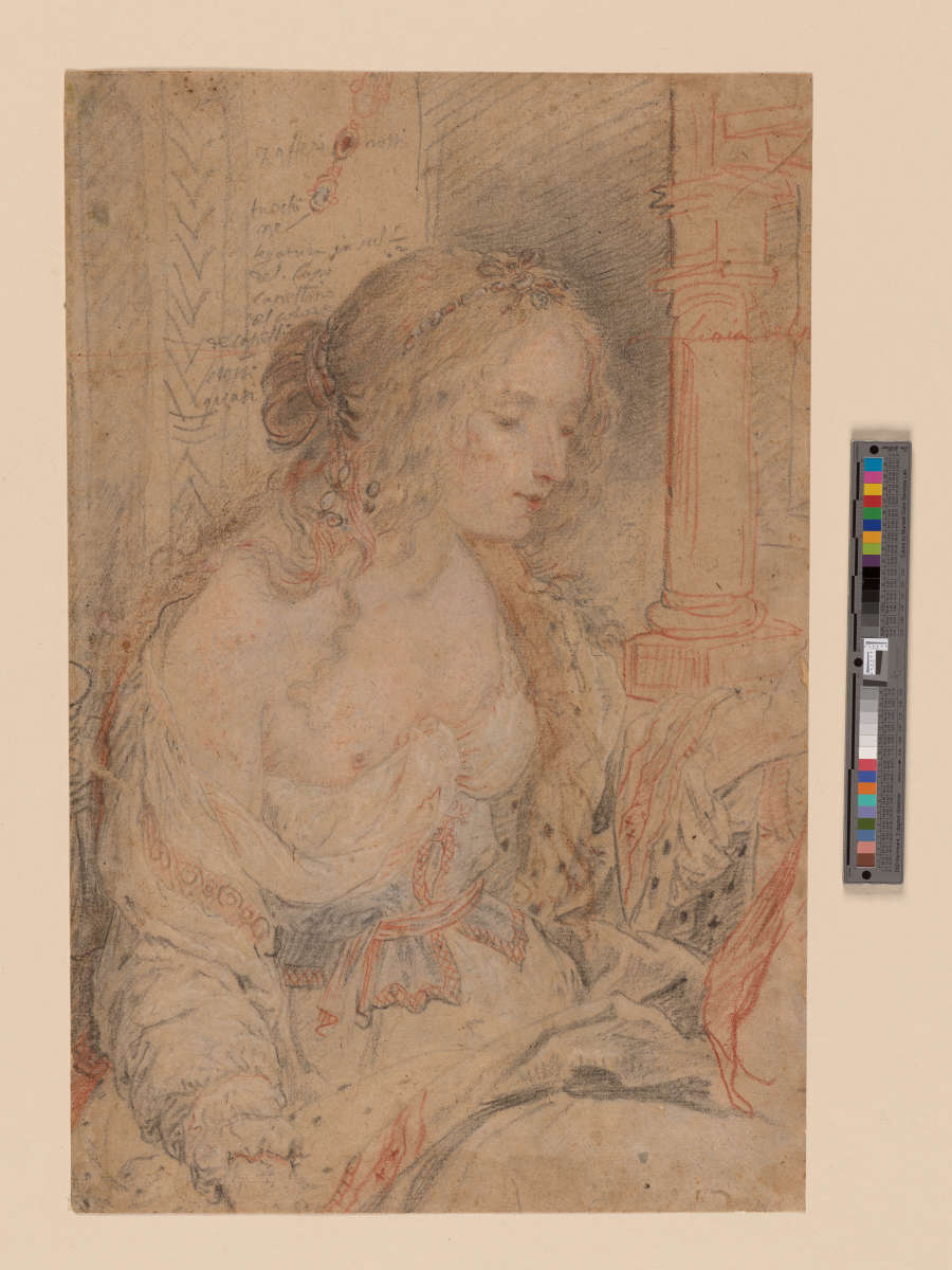 Inscribed on recto in black chalk, partially legible: "Zafferi rossi / fuochi / ... / legatura in sal ... / del capo / capellino / del colore / de capelli / stessi / quasi"; and in red chalk: "linea del p..."