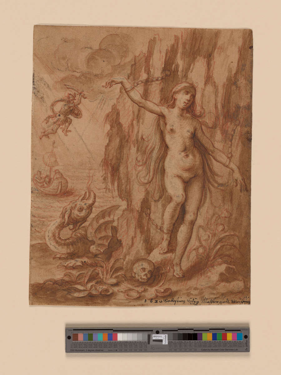 Double-sided sheet: Recto: Perseus and Andromeda; Verso: Man in a hat with four lines of verse and the word 'Enswih'