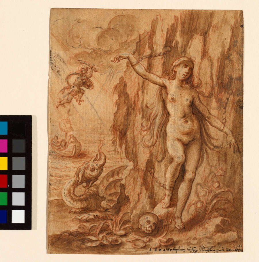 The images on this website can enable discovery and collaboration and support new scholarship, and we encourage their use. This object is in Copyright. This object is Double-sided sheet: Recto: Perseus and Andromeda; Verso: Man in a hat with four lines of verse and the word 'Enswih' with the accession number of 1997.18. To request new photography, please send an email to imagerequest@risd.edu and include your name and the object's accession number.