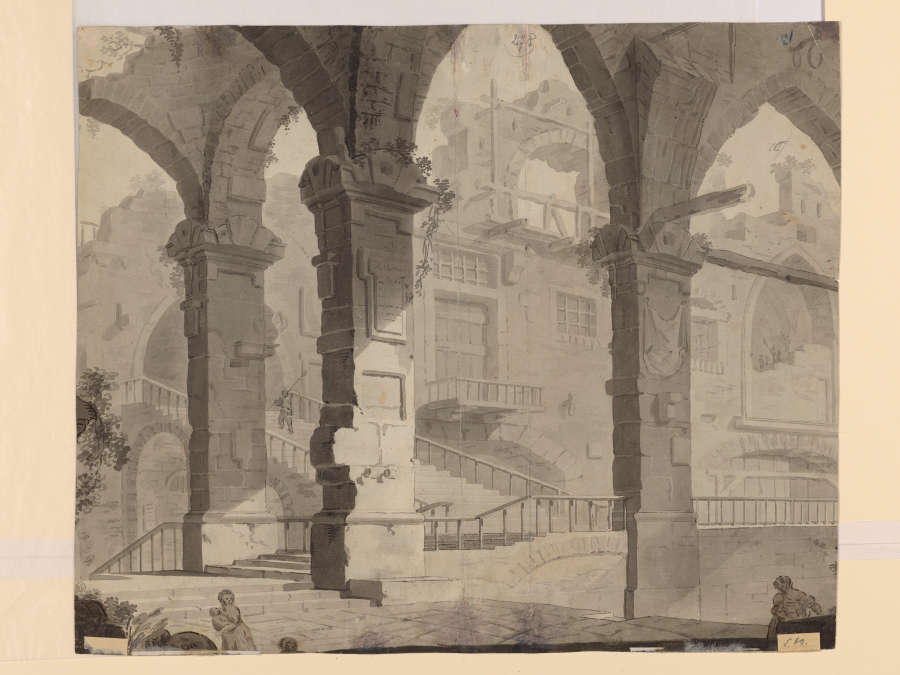 Double-sided sheet: Recto: Stage setting in antique funerary hall; Verso: Stage design for a ruined portico