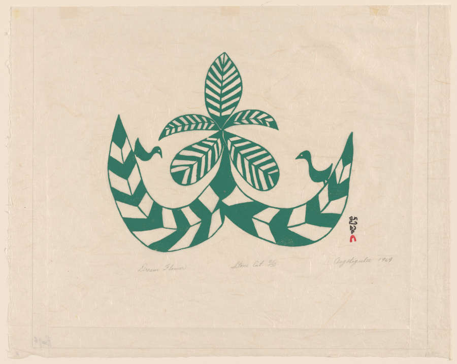 Signed in pencil at LR:Angotigulu; inscriptions in pencil at LL and LC. Cape Dorset community stamp at LR.