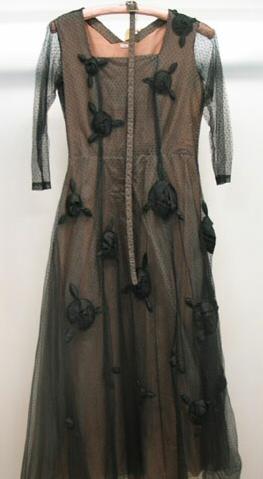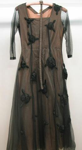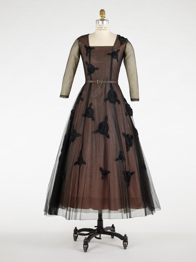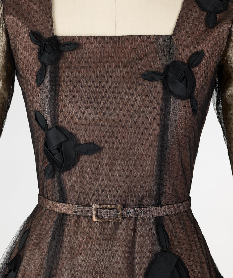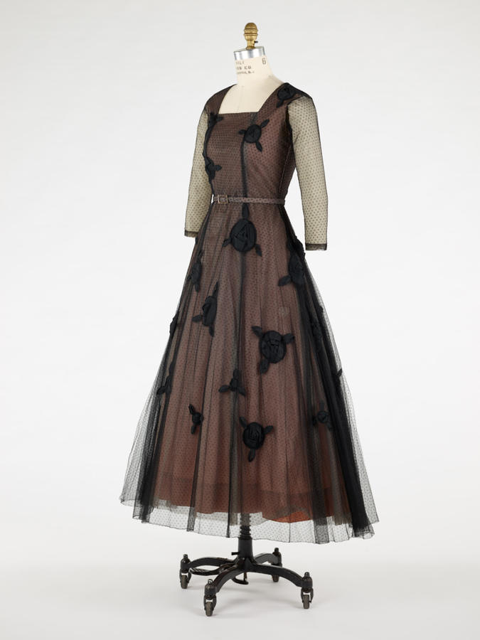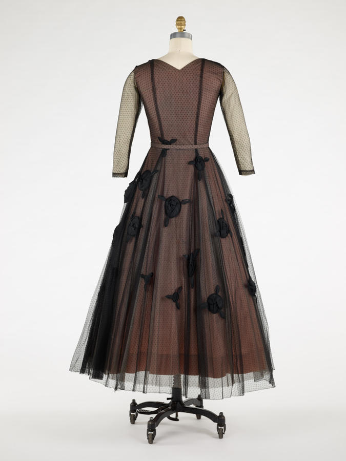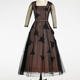 Silk swivel-woven fabric (dotted-swiss lace) with cutwork and appliqué, pink acetate underdress