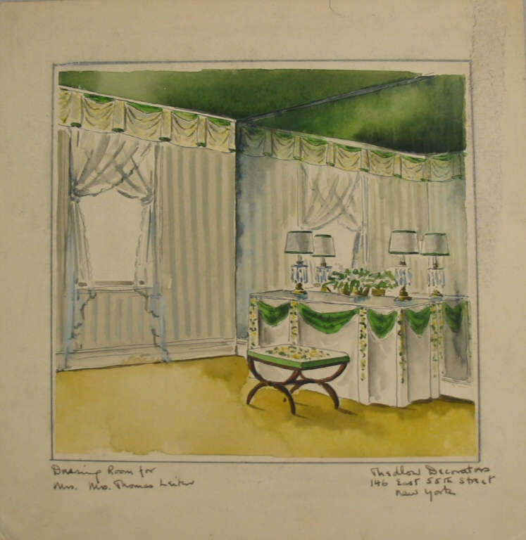 In black ink script; "Dressing Room for Mrs. Mrs. Thomas Leit(?)r / ThEdlow DEcorators 146 East 55th Street New York"