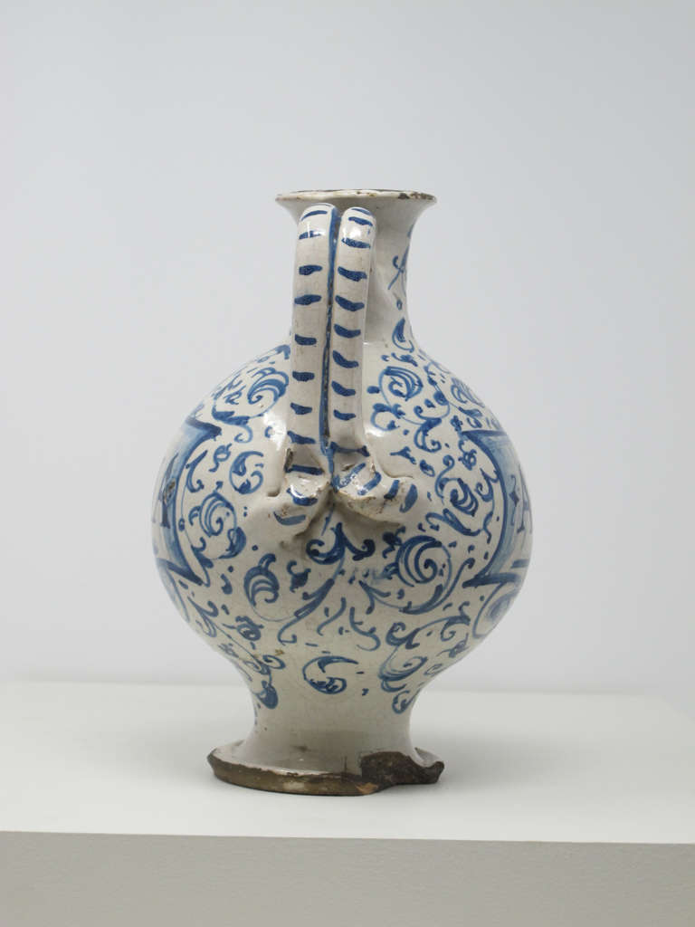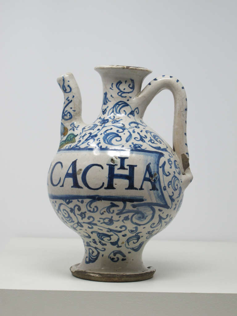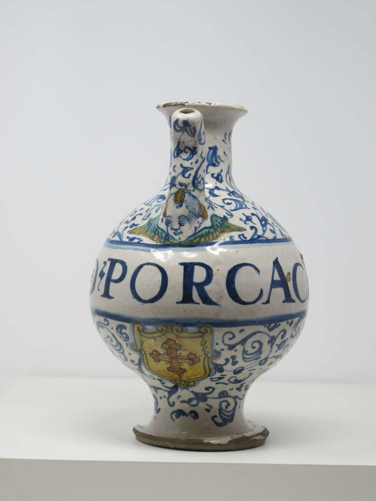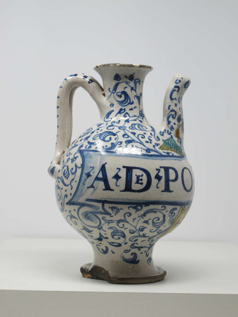 Drug jar with handle and spout, inscribed "A De Porcachia"