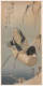 [text and poems] Kamo naku* ya (translates to) A duck calls softly; kaze fukishiwamu* (translates to) a breeze starts ripples moving mizu no omo (translates to) over the water (trans. Marks in Bogel) The Amsterdam cat. below remarks that the cat. of Museo Chiossone (1978, cat. no. 5) says that the poem is a haiku by Sugisaka Hyakumei (b. 1784).* Bogel transcribes the word as "naki" however "naku" is preferable. The word fukishimu is close to the word fukishiwamu which means to play the flute quietly or intently. A synthesis of more literal translations, such as that provided in the Amsterdam cat., can read:A duck cries- the blustering wind ripples the surface of the waterThe Japanese links the "crinkling" or "rippling" to the wind, perhaps to give the sense of the wind blowing this way and that, stirring the water in the process, rather than the sense of blowing onto the wind in one direction to cause the rippling. "Softly" does not appear in Japanese as it does in the Marks translation; the duck's call is evocative of the chill and loneliness although Marks points out that the Japanese does not find the duck's call abrasive. Kamo, duck, is a season word (kigo) of autumn.* transliteration changed from that given by Marks in Bogel