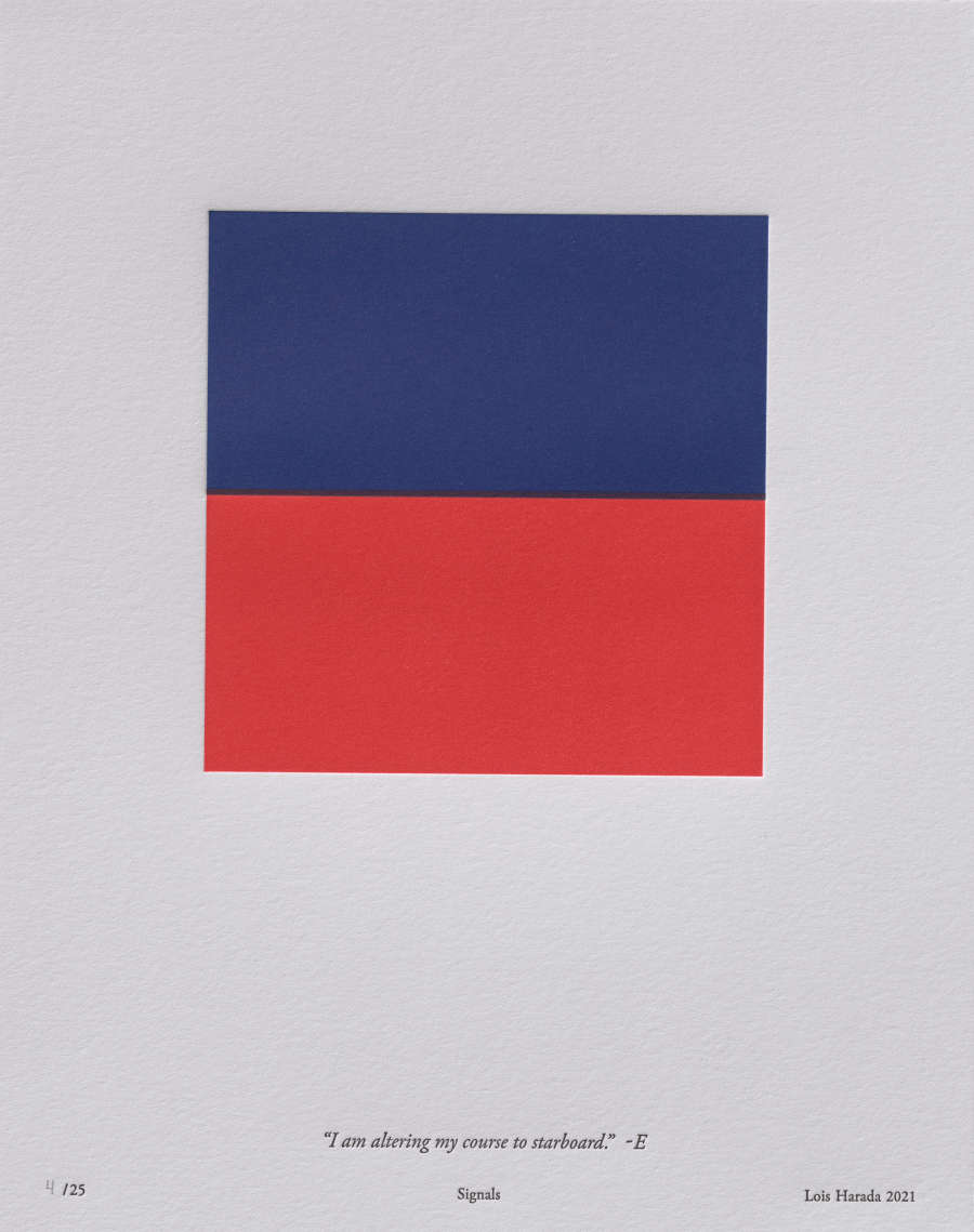 On recto, “4” inscribed in graphite LL within line printed in black ink at bottom that reads “/25 Signals Lois Harada 2021”