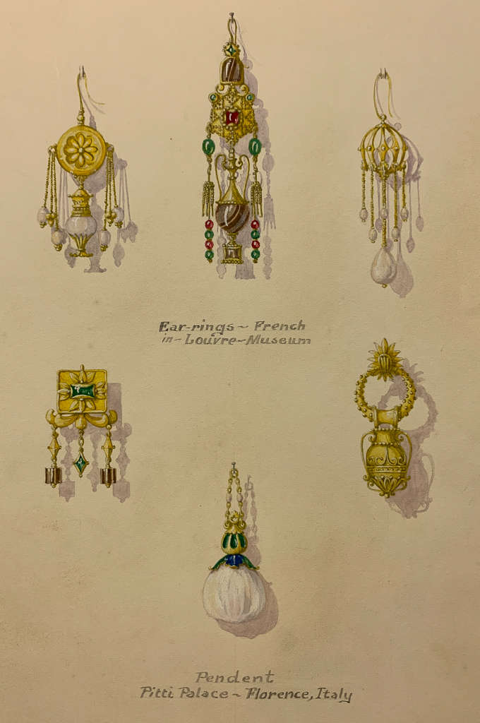 Written, center:Ear-rings-French in-Louvre Museum; at bottom:Pendant Pitti Palace-Florence, Italy