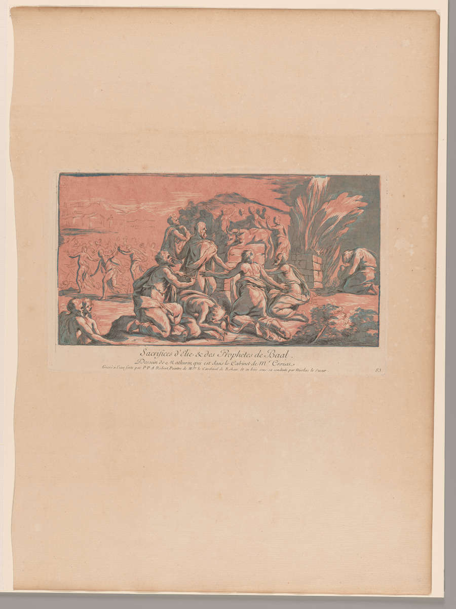 Lettered below image: "Sacrifices d'Elie & des Prophetes de Baal. Dessein de Mathurin, qui est dans le Cabinet de Mr Crozat. Grave' a l'eau forte par P P A Robert, Peintre de Mg.r le Cardinal de Rohan, et en bois sous sa conduite par Nicolas le Sueur"