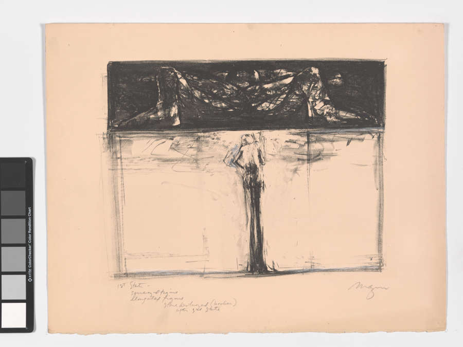 Inscribed in graphite, LL: "1st state - squeezed figure / elongated figure / elongated figure / stone destroyed (broken) / after 3rd state" ; LR: "Mazur" -- on print, proof has been retouched with white chalk/watercolor