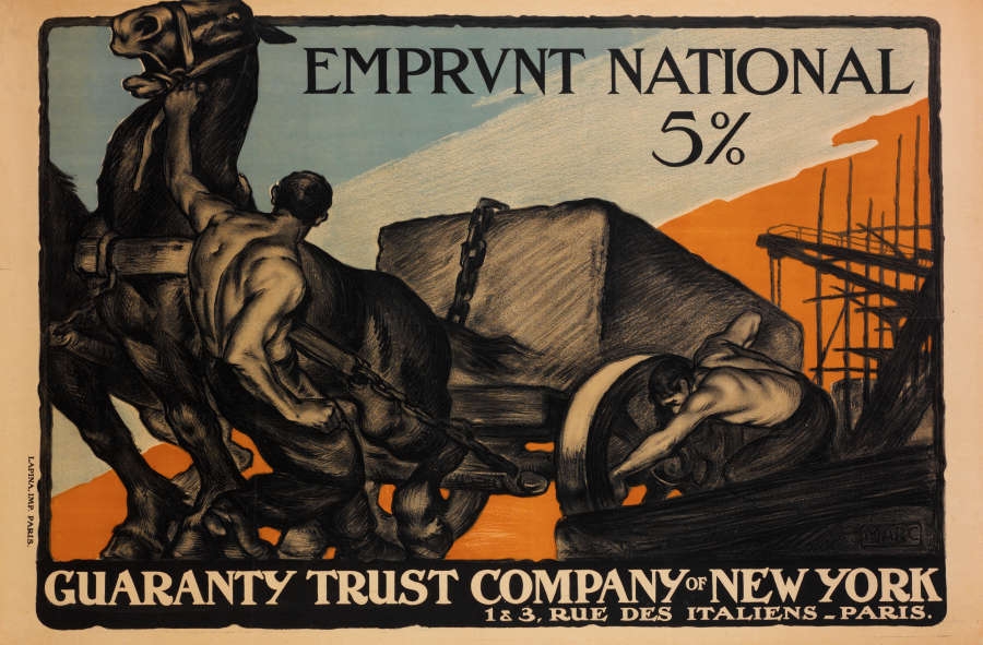 Signed in stone LR quadrant: MARC; title lithographed at top portion: EMPRUNT NATIONAL/ 5%; title lithographed at bottom portion: printer name printed vertically in left margin: LAPINA, IMP. PARIS.
