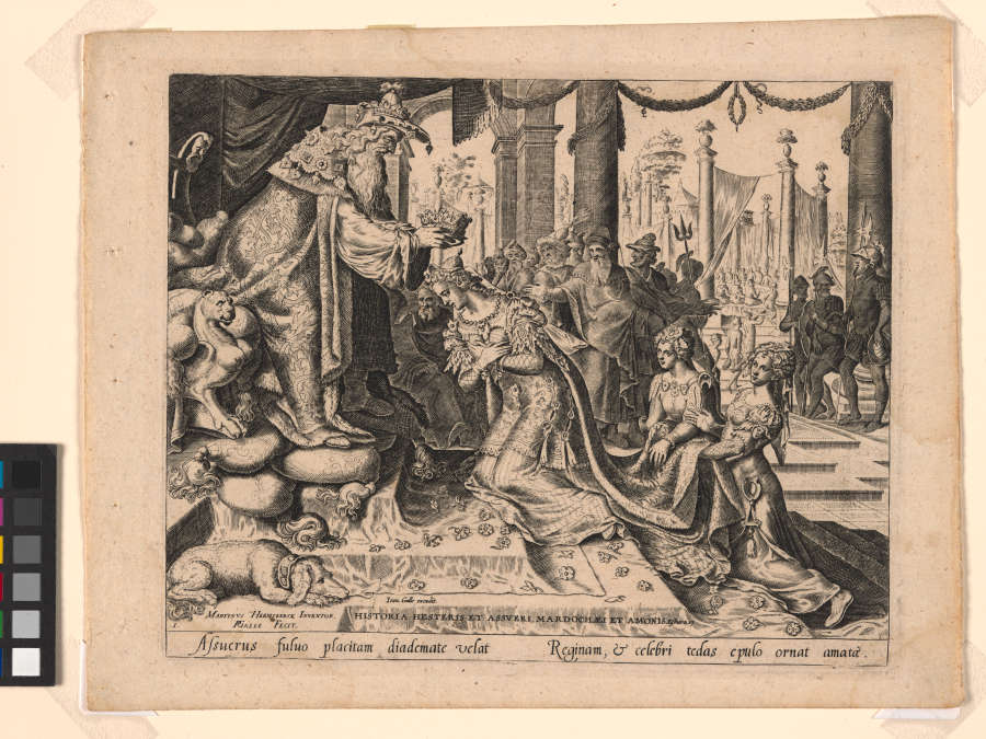 Printed, LL, on image: I./Martnvs Heemskerck Inventor, Galle Fecit; Printed, LC, on image: Ican, Galle excudit./ Historia Hesteris Et Assveri, Mardochei Et Amonis; Printed, on sheet, LL to LR: Afsuerus fuluo placitam diademate velat/ Reginam, et celebri tedas epulo ornat amata.