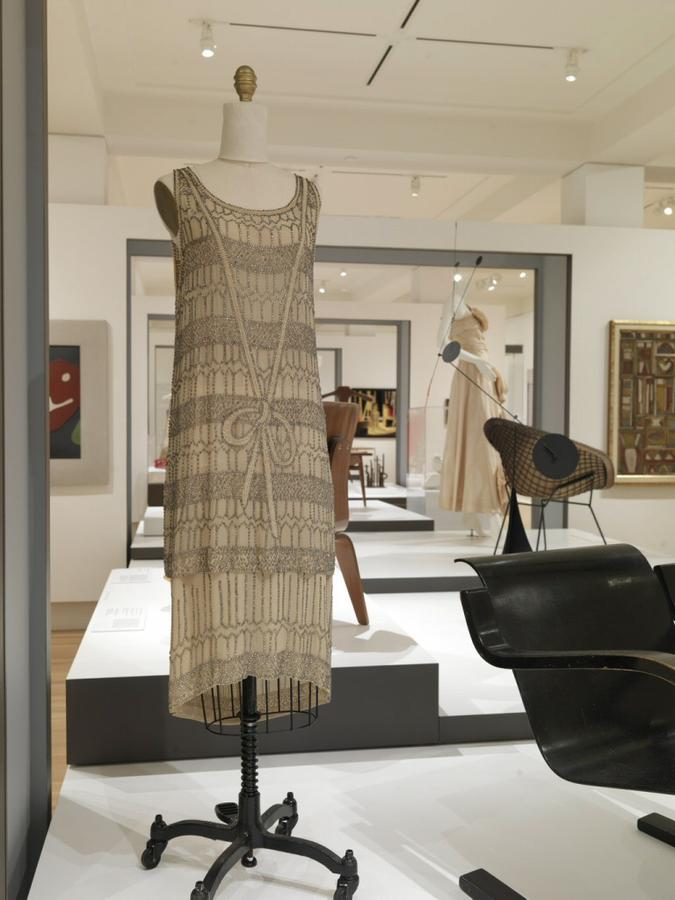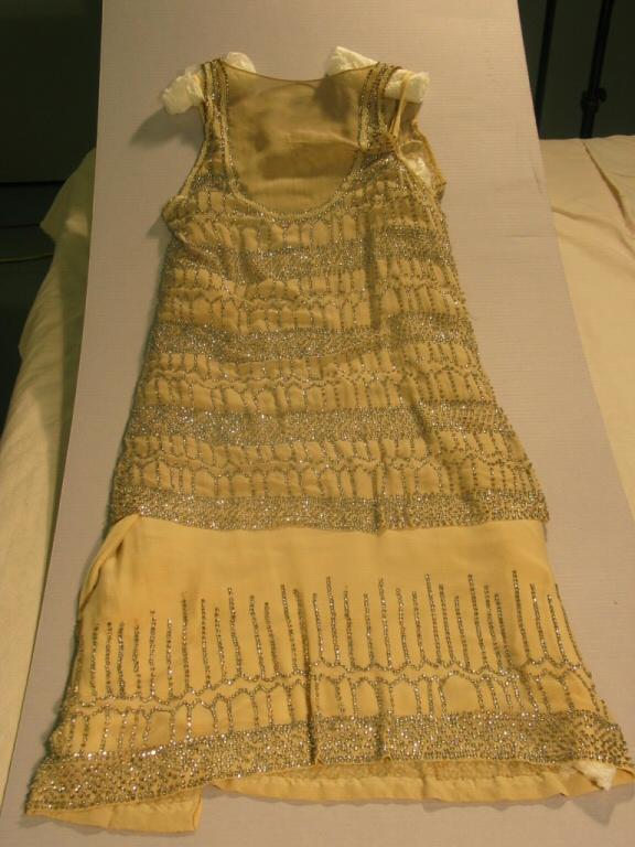 Silk, rhinestones, faux pearls; crepe yarn, plain weave, embroidered