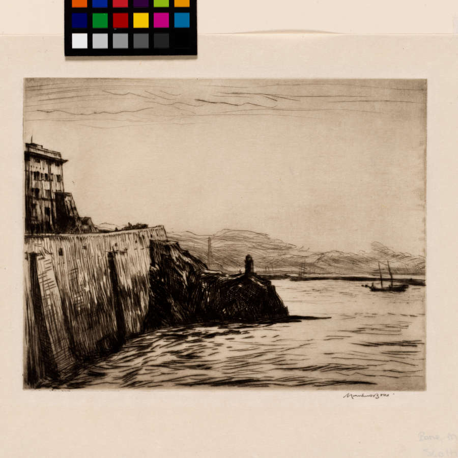Original--Recto:signed in pencil in LR:Muirhead Bone; inscribed in LL:I (illegible) 7; titled in LC:Evening, Genoa; inscribed in LR:A15422; numbered in LR:9 Verso:initialed in pencil in UL platemark:M; numbered in LR of platemark:22; illegible inscription in LC of sheet.