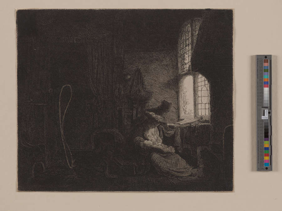 Original--verso:inscribed in pencil in center:B.4 only state/La FamilleIn Plate--signed and dated in circular windowpane on right: F. Bol/1643