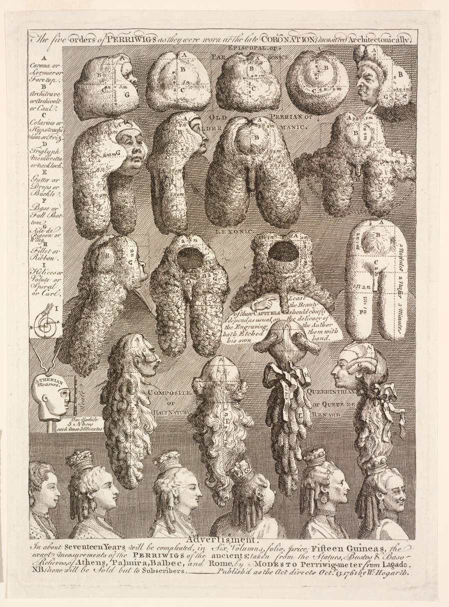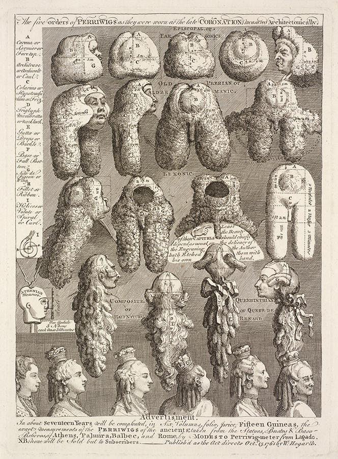 Original--Verso:numbered in pencil in LL:17084;lettered in LR:AIn Plate--Titled along top:the five orders of PERRIWIGS as they were worn at the late CORONATION, measured Architeconically; inscribed in LC:Advertisement/In about Seventeen Years will be completed in Six Volumes, folio, price Fifteen Guineas, the/exact measurements of the PERRIWIGS of the ancients; taken from the Statues, Bustos & Baso-/Relievos of Athens, Palmira, Balbec, and Rome by:MODESTO perriwig-meter from Lagado./N.B. None will be Sold but to subscribers.___Publish'd as the Act directs Oct. 15, 1761 by W: Hogarth