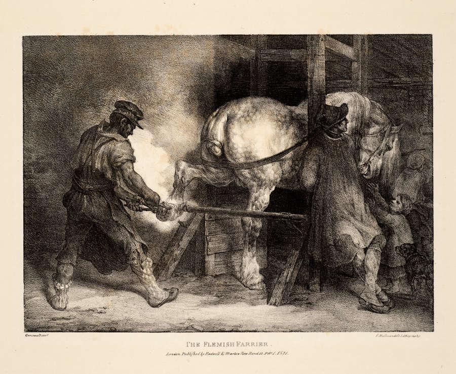 Lettered LL: "Gericault invt."; LC: "THE FLEMISH FARRIER . London. Published by Radnell & New Bond St. Feby. 1. 1821."; LR: "C. Hullmandel's Lithography."
