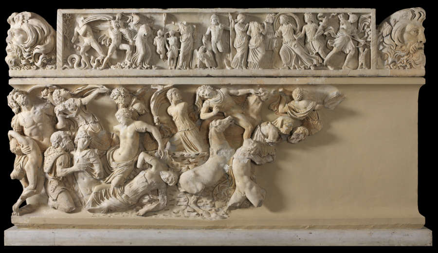Fragmentary sarcophagus front and lid depicting The Slaughter of the Niobids, end of the 2nd century CE