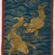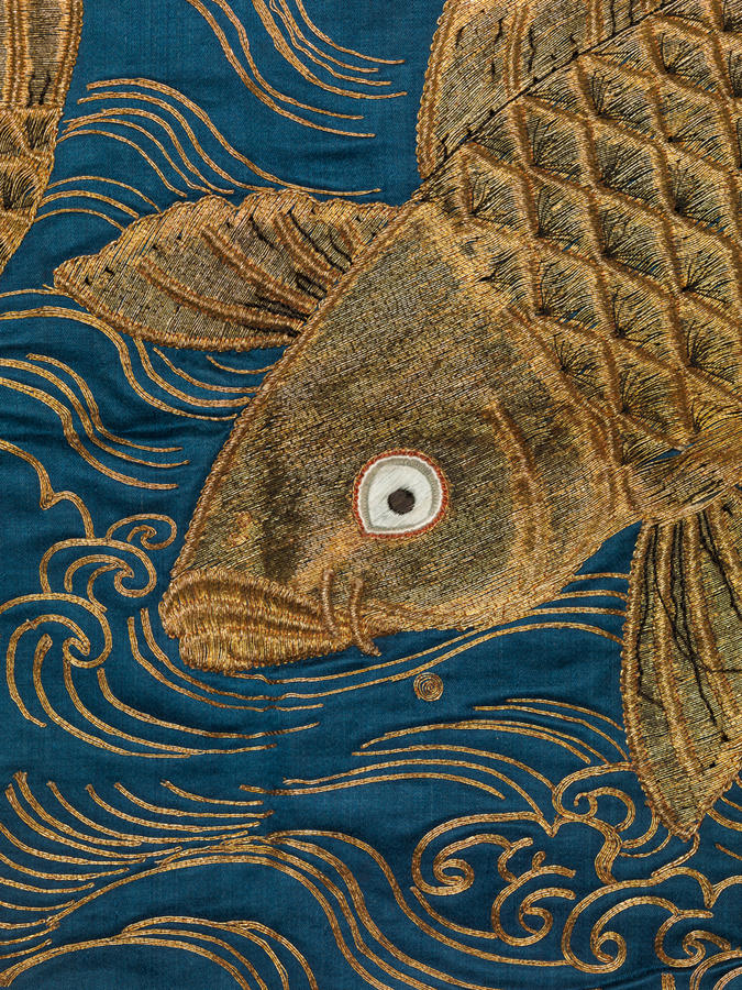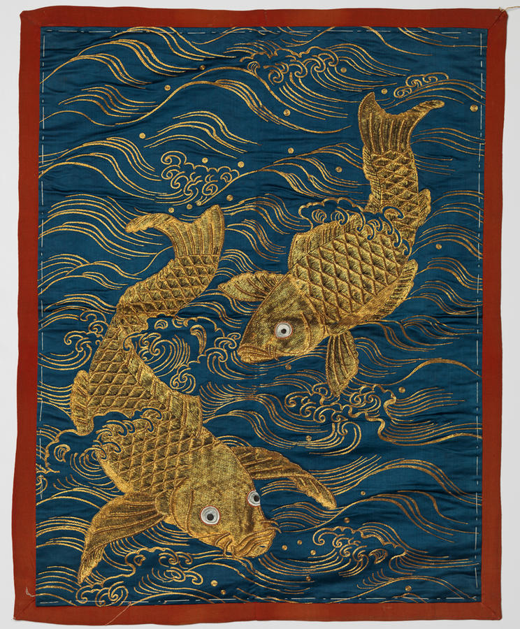 Silk; satin, embroidered with silk and metallic thread in couching, satin stitch, and stem stitch