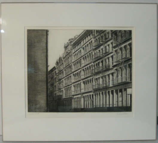 Signed Richard Haas at lower right, titled Greene Street at lower left, and dated 73 at lower left center