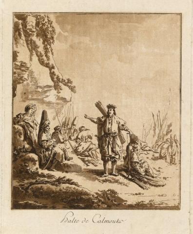 Original--Verso:inscribed in pencil in center:2In Plate--titled in LC: Halte de Calmouks; Signed and dated in LL:Le Prince 1772;