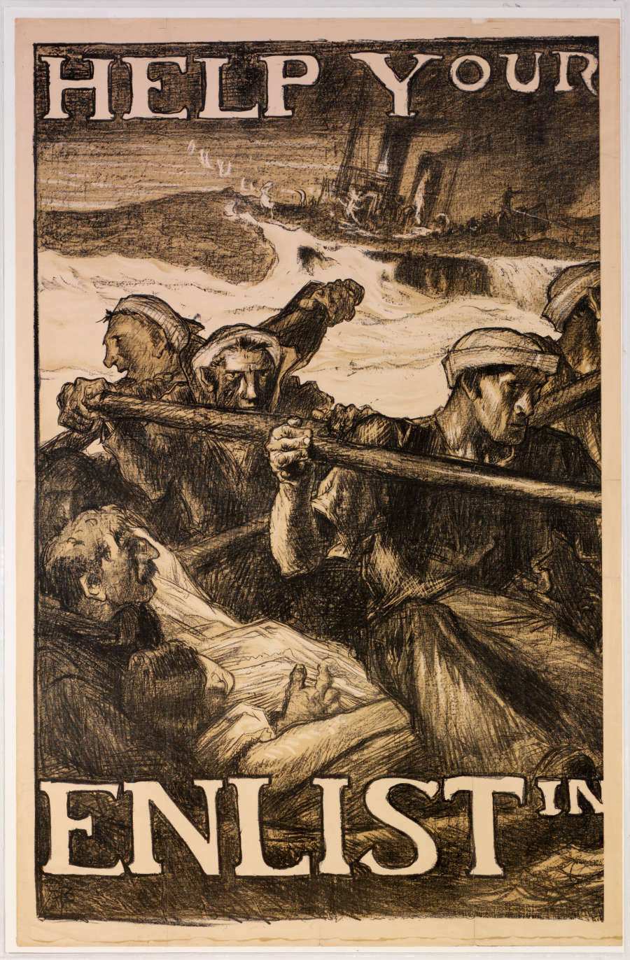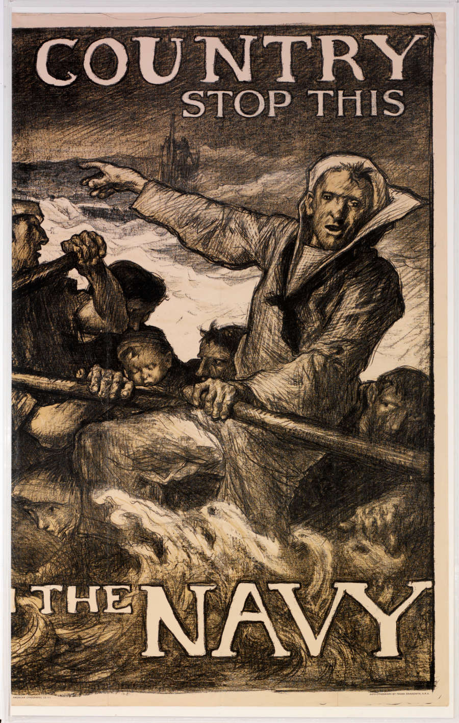 Artist initials signed in stone: "F.B." in LL corner in L piece of poster; title printed on top: "HELP YOUR COUNTRY STOP THIS"; inscribed in bottom: "ENLIST IN THE NAVY"; inscribed in LL on R piece of