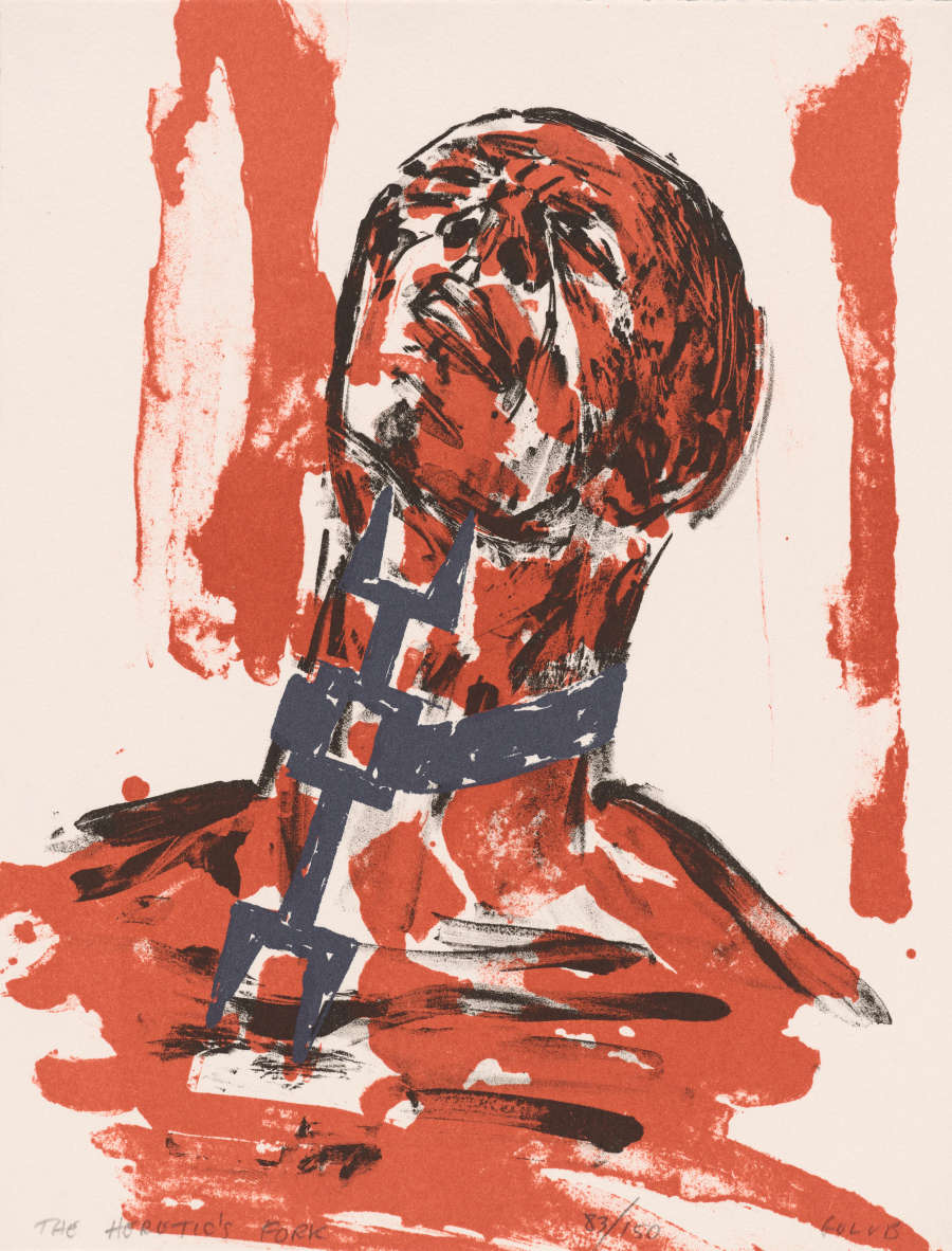 Recto: inscribed and signed in graphite: LL: "The Heretic's Fork"; LC: "83/100"; LR: "Golub"
