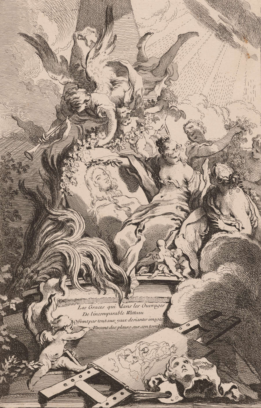 In Plate--In LL:Boucher inenit. et sculp.; in LC:A Paris chez Huquier rue S. Jacques au coin des Mathurins C.P.R.; four line French poem in LC:Les Graces qui dans... (see print)