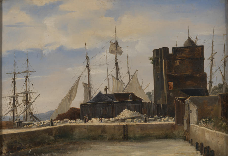 Marks: In the upper center of the frame is a piece of dirty white tape, upon which is inscribed in blue pen ".994." [9s could be gs]. TO the right of this tape, inscribed in pencil and faded is the RISD accession number "43.007".In the upper right corner of the frame is a new white rectangular label with rounded corners upon which is inscribed in black "C/NO. 45" [horizontal line and beneath that inscription in red ink] "/".IN the lower right corner of the frame is a series of illegible white chalk marks one of which may be an "R".In the lower left corner of the frame is alime green rectgangular label upon which is printed in dark green "The/ FOREST of FONTAINEBLEAU/ REFUGE of REALITY/ French Landscape 1800 to 1870". IN upper left corner of the stretcher is the RISD accession number painted in red.In lower center of the stretcher is a square paper stamp with serrated edges and a perforated vertical and horizontal line. The stamp has dark blue decorations at the edges and in the center with many numbers and letters(possibly stamped) including "USA(?)" and "26".In thelower left corner of the stretcher is a rectangular white faded label with serrated edges on which is typed "_COROT_ 3148/"Honfleur, le vieux bassin/vers 1830/Robaut NR. 35/41,7:29 cm".On the top portion of the vertical brace, in blue ink is written "CA 1409" (underlined).Below the blue ink are the remains of a circular stamp upon which are two concentric circles with visible and illegible writing.Below the circular stamp in dark ink and written vertically "R (?) H4013"; beneath this "SK/5338". On the back of the canvas on the right half are thefaint remains of two circular stamps.On the backing board are six relatively new labels (beginning with the upper left corner and moving clockwise) "RMN/NGC/MMA, 2. Metropolitan 1996-7"; "3 RISD 4. The Dixon Gallery and Gardens, Memphis, Tenn. 1987-8 5"; "Reunion des musees nationaux, Paris 6" and finally in the center an "In the event of Damage label".