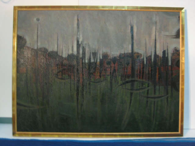 Signed and dated lower right: "Reynolds 1953." Verso bellow upper stretcher: "'Hop Garden Red - Blue-