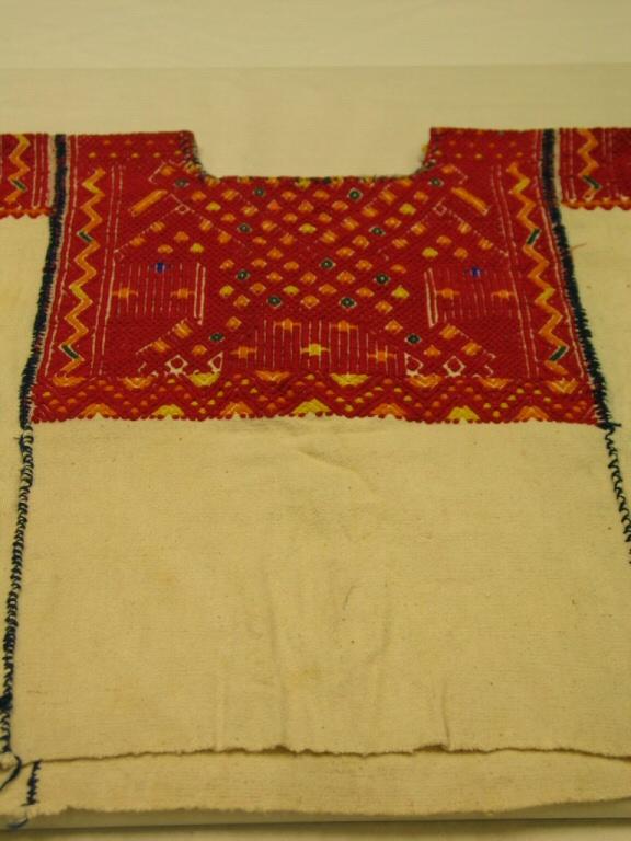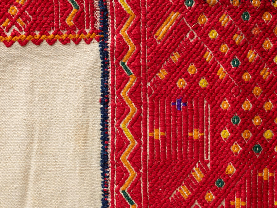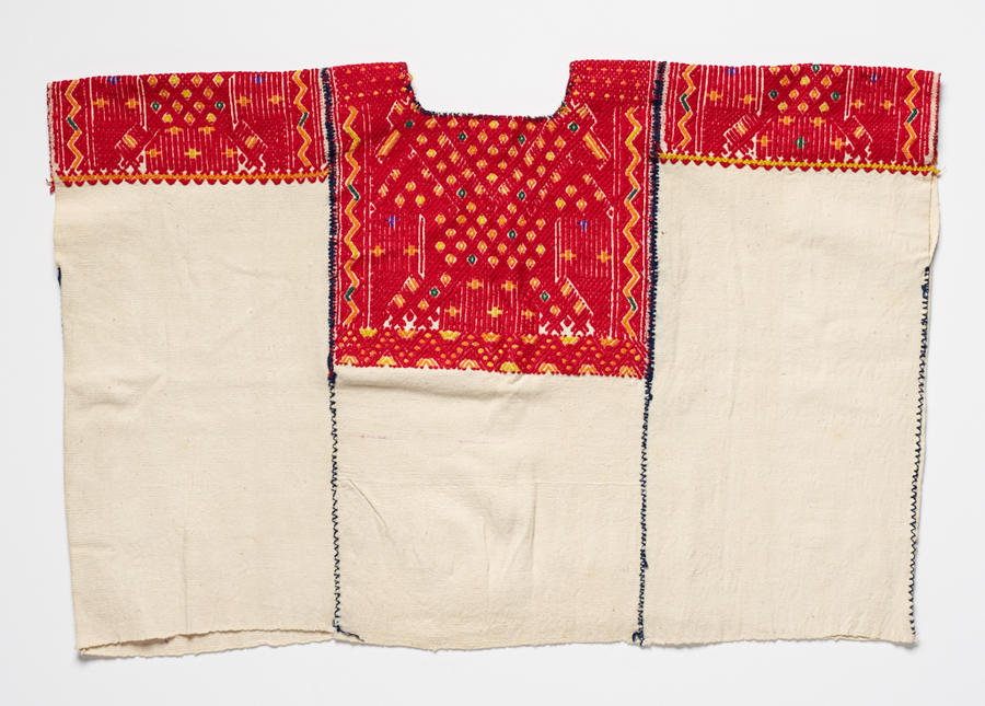 Backstrap-loom-woven cotton plain weave with cotton and silk supplementary weft patterning and cotton embroidery at seams