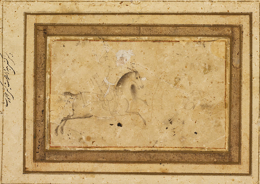 Inscription: Written vertically with black ink left of the folio in Persian: