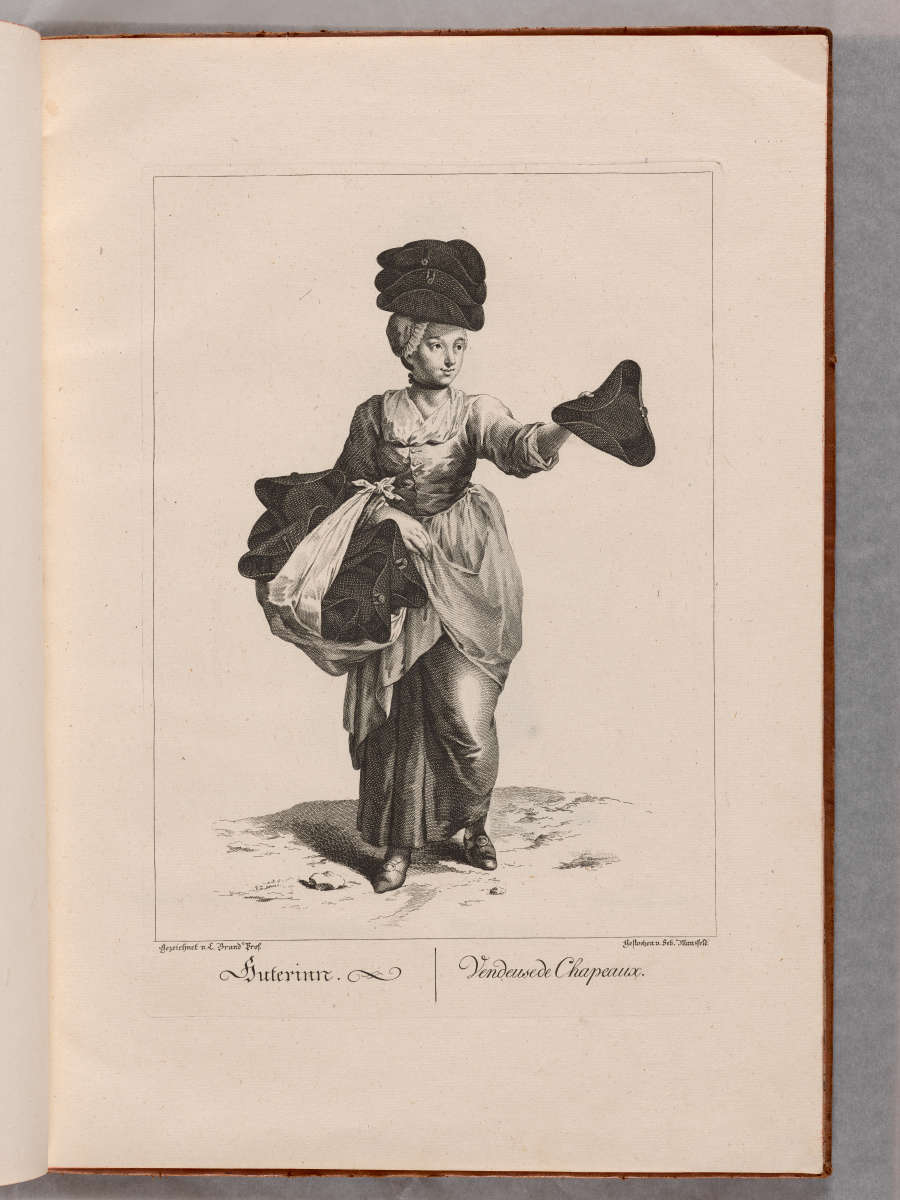 Lettered below image: "Gezeichnet v. C. Brand Prof. / Gestochen v. Seb. Mansfeld"; and "Huterinn - Vendeuse de Chapeaux"