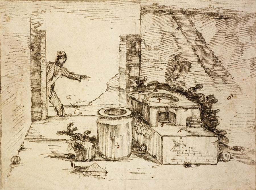 Verso: inscribed in pen an ink in an 18th-century hand:"Tav. 27" and "veduta interna della Taberna situata nella Strada che conduce alla Porta della Citta' e' sta' a man sinistra prima della Casa del Chierurgo" [sic]