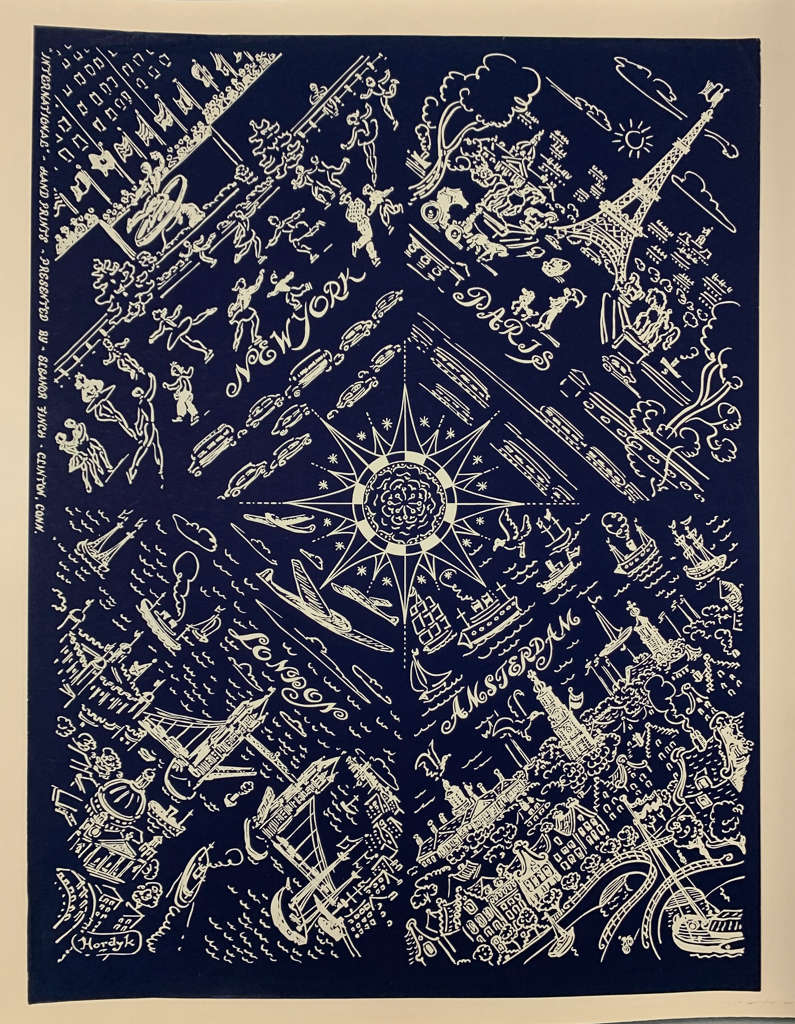 Marks: Printed LL:INTERNATIONAL - HAND PRINTS - PRESENTED BY - ELEANOR FINCH = CLINTON, CONN.; in reserve at LR:Hoodyk