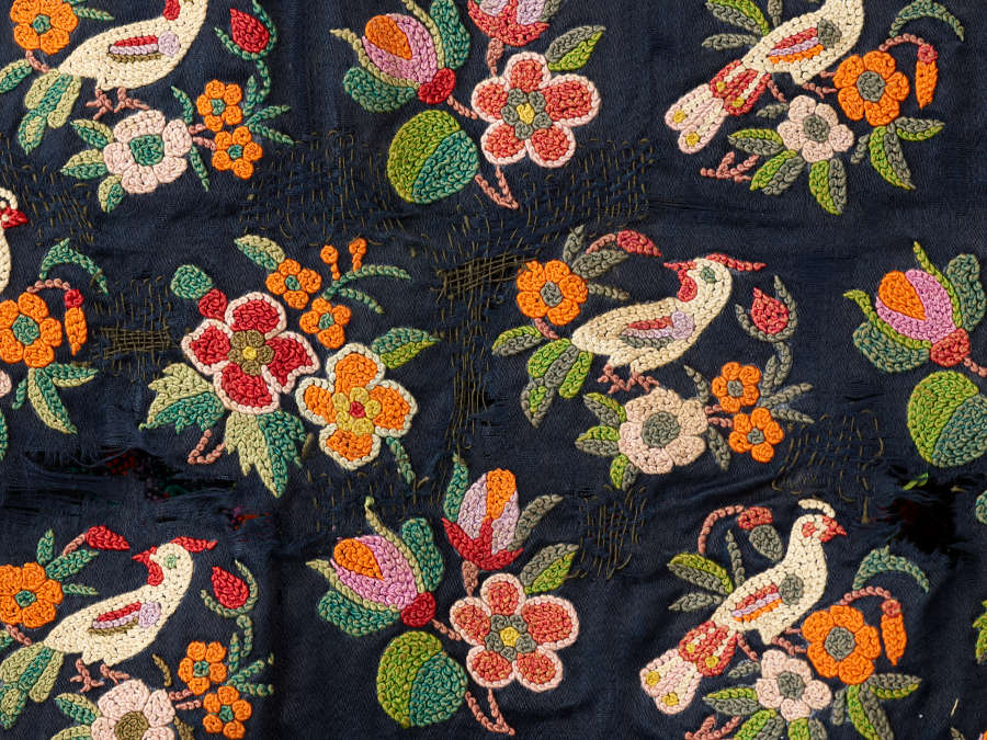 Silk, satin weave, embroidered with silk twist in knot stitch