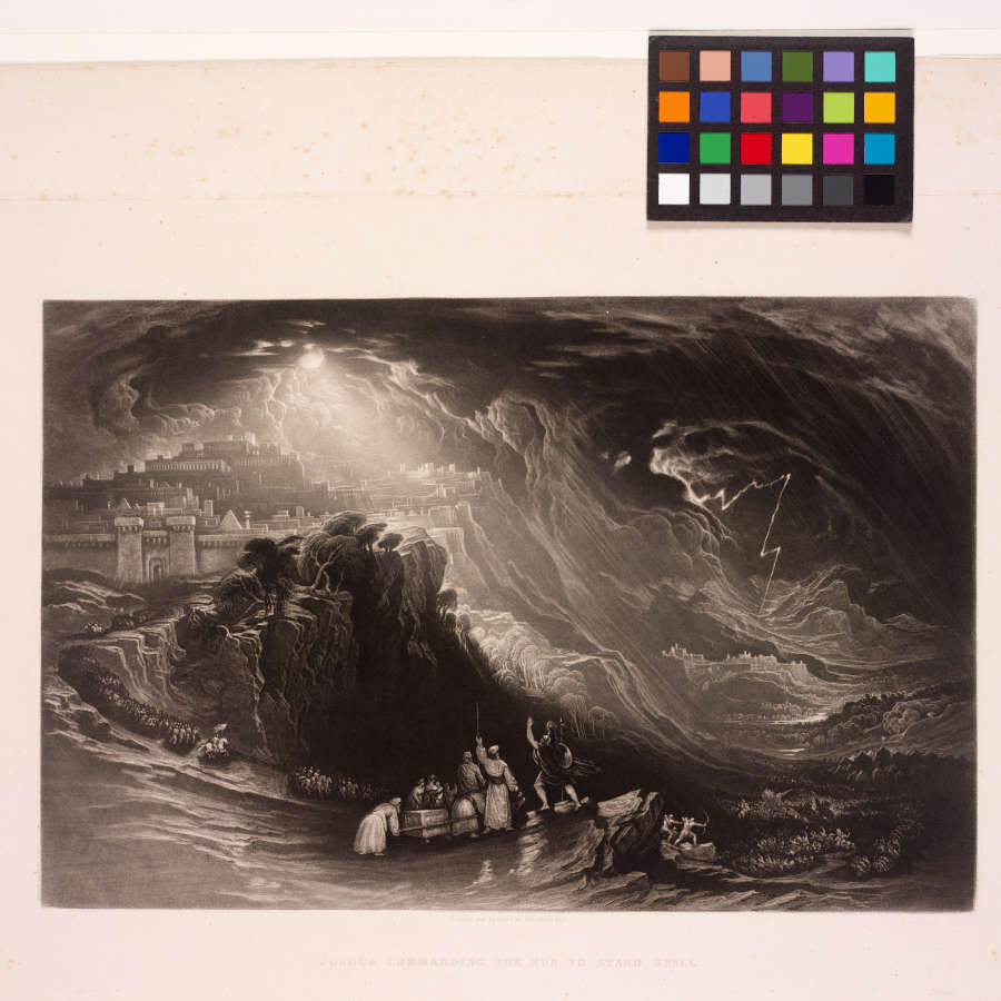 Original--Recto:in pencil inscribed, LR:C379425In Plate--Inscribed, LL:PROOF ; inscribed, LR:Deposé ; inscribed, LC:Designed and Engraved by John Martin K. L. B./JOSHUA COMMANDING THE SUN TO STAND STILL./London.Published May 1.st 1835, by John Martin, 30 Allsop Terrace, New Road:/Mess.rs Ackermann & C°. __A Paris, chez M. Victor Morlot, Passage Vivienne, N°. 26./PART VIII