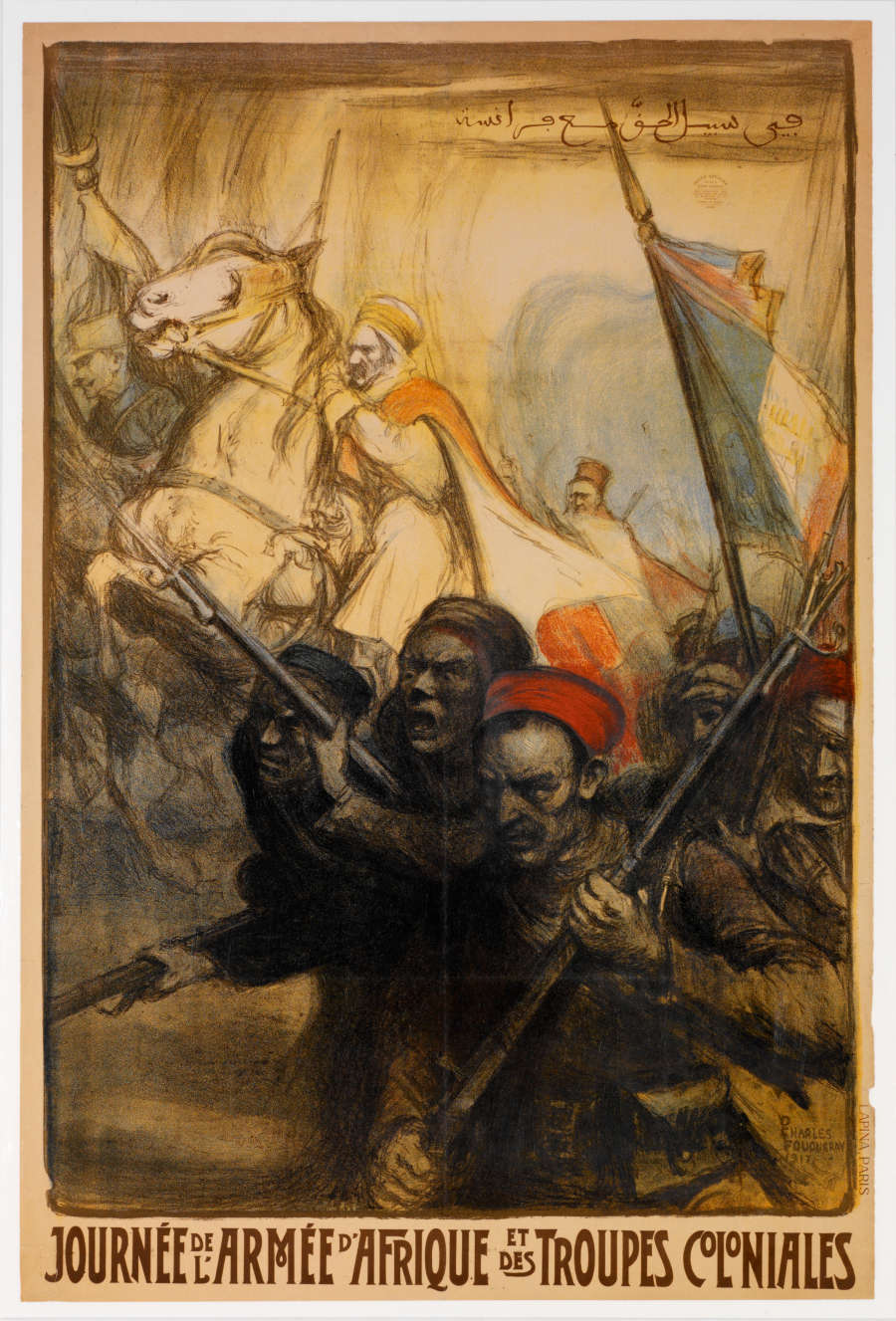 Arabic writing in UR quadrant; artist signature signed and dated in stone in LR corner: "D / CHARLES / FOUQUERAY / 1917" ; inscribed vertically on LR margin: "LAPINA"; printed on bottom edge: "JOURNÉE DE L'ARMÉE D'AFRIQUE ET DES TROUPES COLONIALES"