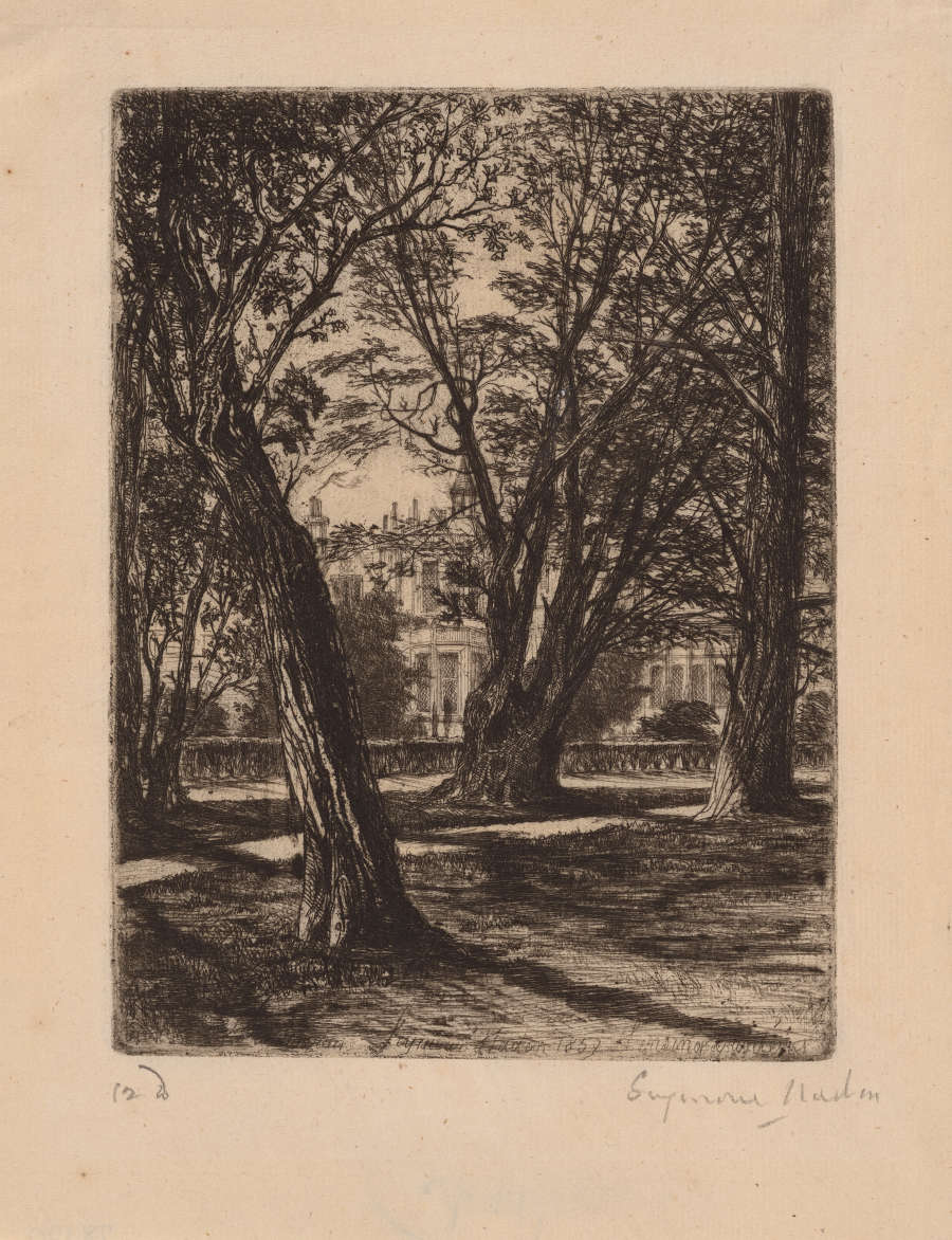 Label: Label on back of frame:From FREDERICK KEPPEL & CO,/Rare Engraving and Etchings./No. 4 East 39th Street, New York/No. F1292 Kensington Garden/original etching by Sir Seymour Haden P.R.A./impression marked by the artist "fine" Identification
