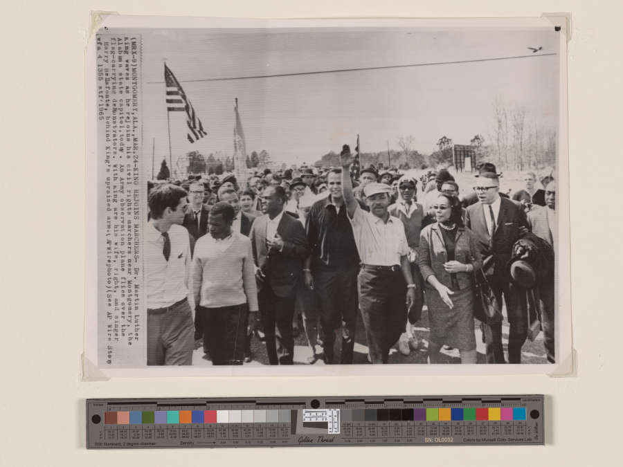 Printed as image, recto: (MRX-9) Montgomery, ALA., MAR.24--KING REJOINS MARCHERS--Dr. Martlin Luther King waves as he rejoins his civil rights marchers near Montgomery, the Alabama state capitol[sic], today. An Army observation plane flies over the flag-carrying demonstrators. With King are his wife, right, and singer Harry Bellafonte [sic],behind King's upraised arm. (APWirephoto) (See AP Wire Story wfa 1355 stf 1965)